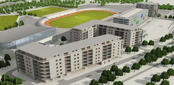 Projekt koncepcyjny zabudowy terenów stadionu sportowego wraz z przylegającymi zabudowaniami.
