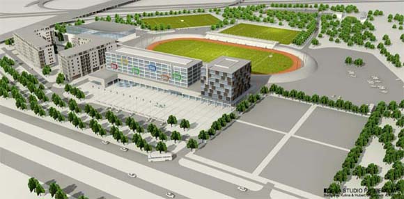 Projekt koncepcyjny zabudowy terenów stadionu sportowego wraz z przylegającymi zabudowaniami.